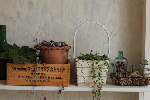 室内でって言われたので、棚の奥のほうにおいてみました。お花咲くのかな??