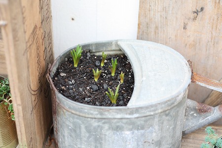 この前、ジョウロに植えたばっかりのムスカリ・・・・