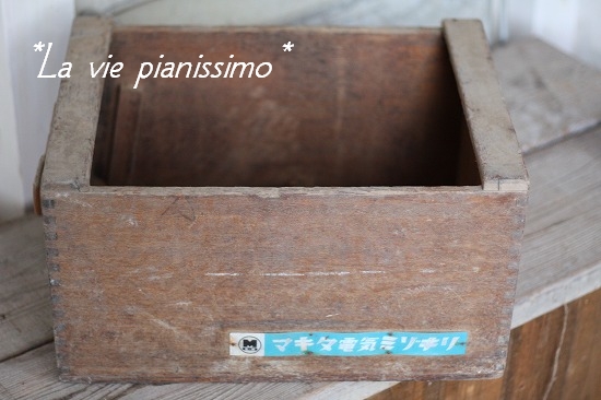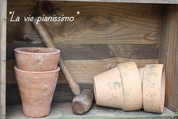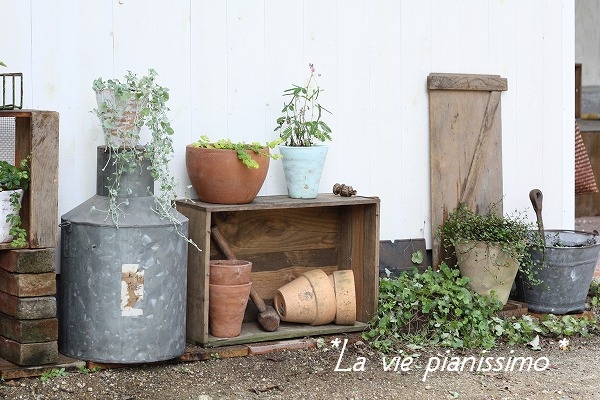 棚が増えたのに、花も緑も増えてないので、ワイン箱を、待機する鉢入れに♫♬
