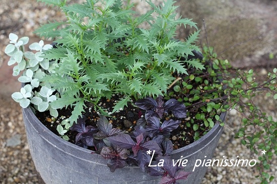 次は、春に買って すごく元気に咲いてくれたイソトマ。 梅雨前に切り戻しておいたら、また元気に復活v(^∀^*)。 そこにお庭にある葉物を挿し木。寄植えにしてみました。